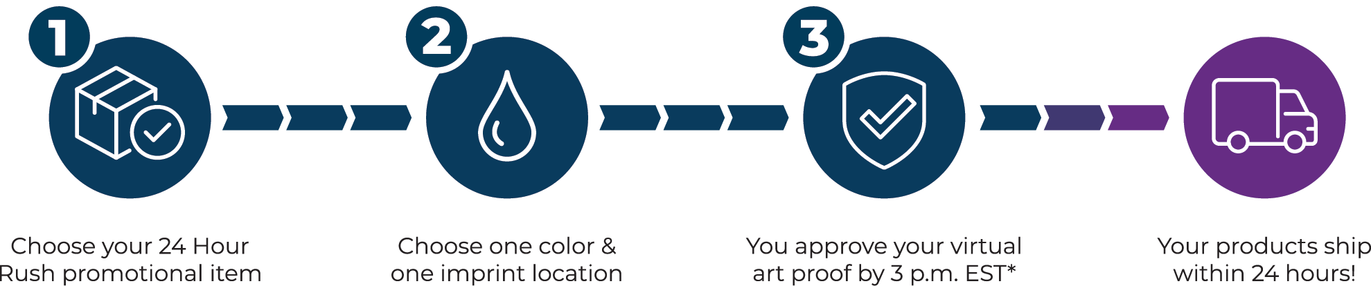 Ordering rush promotional products is simple. Here's how we make sure your custom items are produced and shipped in just one business day: