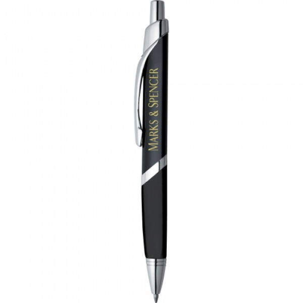 The SoBe Ballpoint Pen has a retractable ballpoint that features a triangular-shaped barrel with chrome trim. It comes in several different colors.