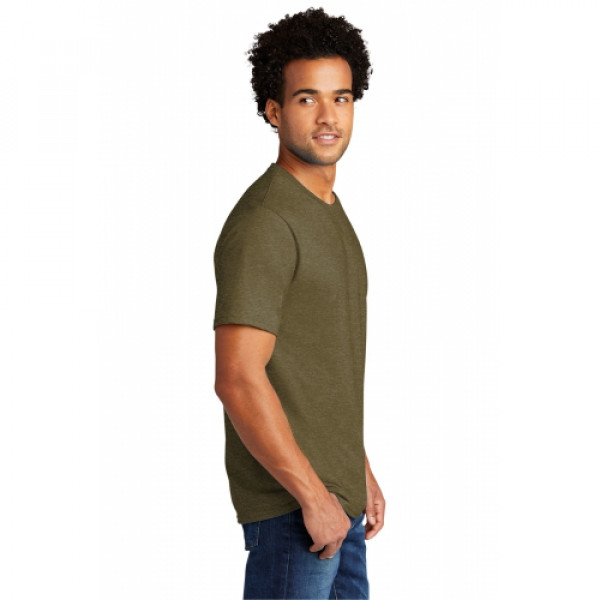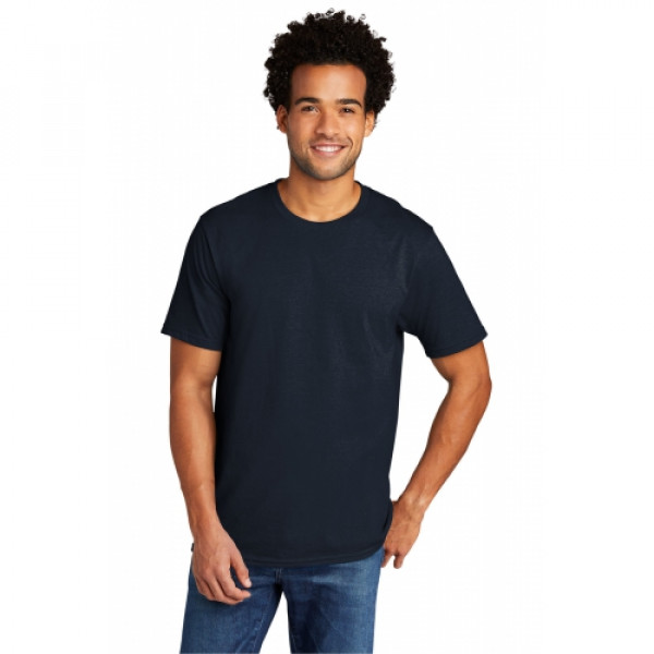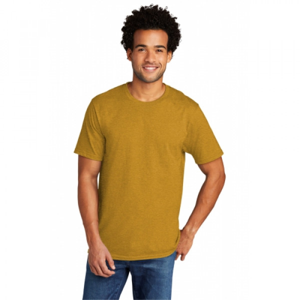 Primed for 24/7 comfort, a proprietary finish gives our tri-blend tee unbelievable softness at a great value.::4.5-ounce, 50/37/13 poly/cotton/rayon::1x1 rib knit neck::Shoulder to shoulder taping::Removable label for comfort and relabeling